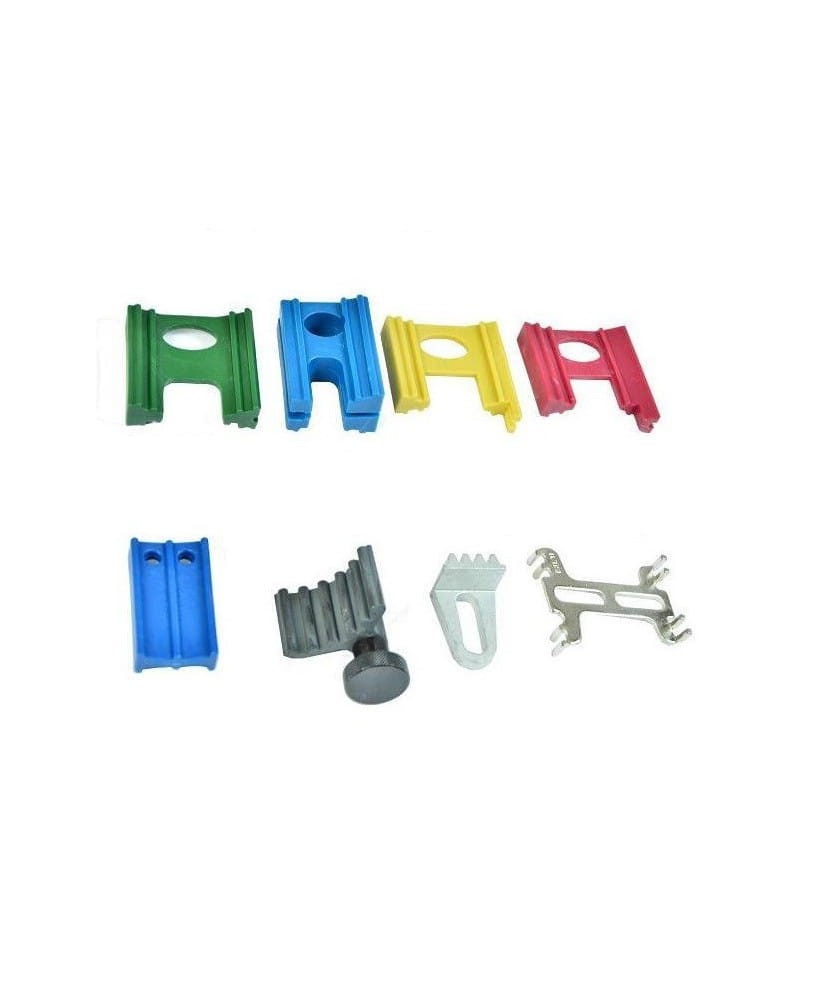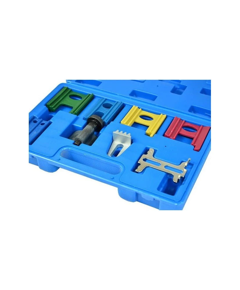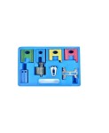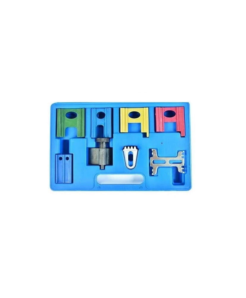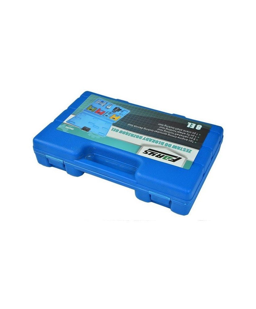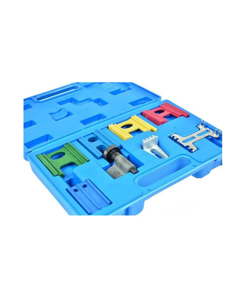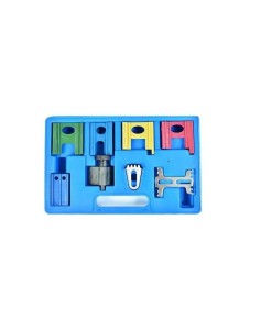 Zestaw blokad rozrządu przeznaczony do warsztatów samochodowych. W skład zestawu wchodzą płytki do blokowania wałka rozrządu, kostka do blokowania wału korbowego, blokady koła zamachowego.