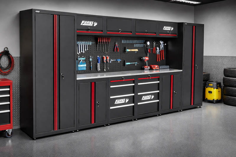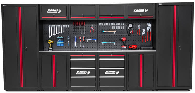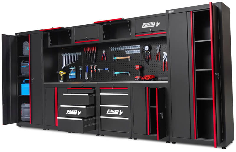 Zestaw mebli garażowych Farys - FR4108Mx2 umożliwia nie tylko uporządkowanie przestrzeni w garażu czy przydomowym warsztacie, lecz także zapewnia wygodną powierzchnię roboczą do drobnych napraw i majsterkowania. Nowoczesny design i kolorystyka nada każdej przestrzeni profesjonalny i elegancki wygląd.