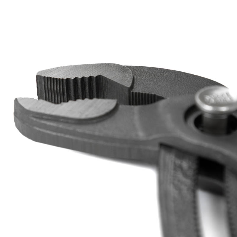 Hartowane szczęki z wyraźnym uzębieniem zapewniają stabilny chwyt nawet przy gładkich powierzchniach.