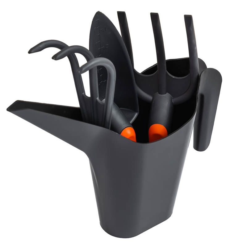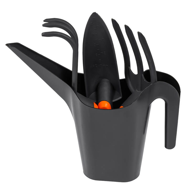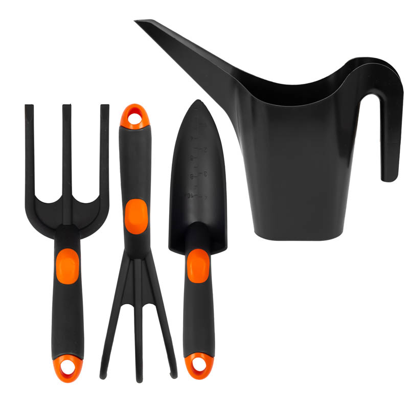 Praktyczny i uniwersalny zestaw narzędzi ogrodniczych 4-elementowy, który zawiera trzy ręczne narzędzia oraz wygodną konewkę. Idealny do codziennych prac ogrodowych — sadzenia, pielenia, przesadzania i podlewania roślin.