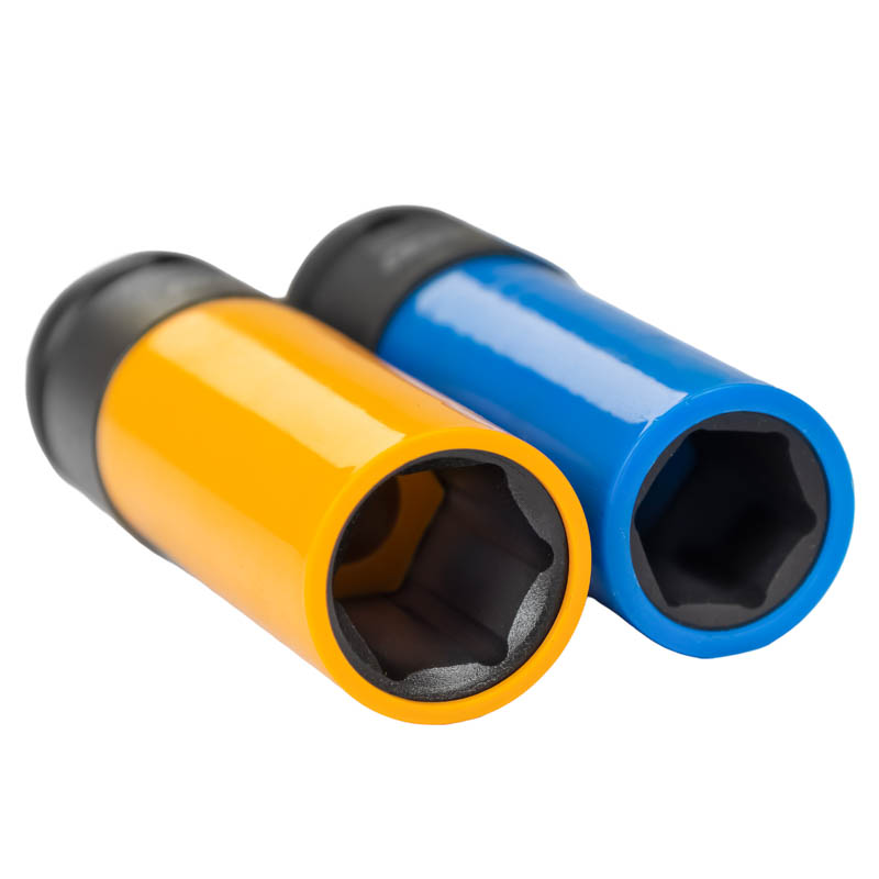 Każda nasadka została wyposażona w plastikową osłonę, która zabezpiecza felgi aluminiowe przed zarysowaniami i uszkodzeniami podczas montażu i demontażu kół. Kolorowe oznaczenia rozmiarów ułatwiają szybką identyfikację właściwej nasadki, co przekłada się na oszczędność czasu i wygodę pracy.