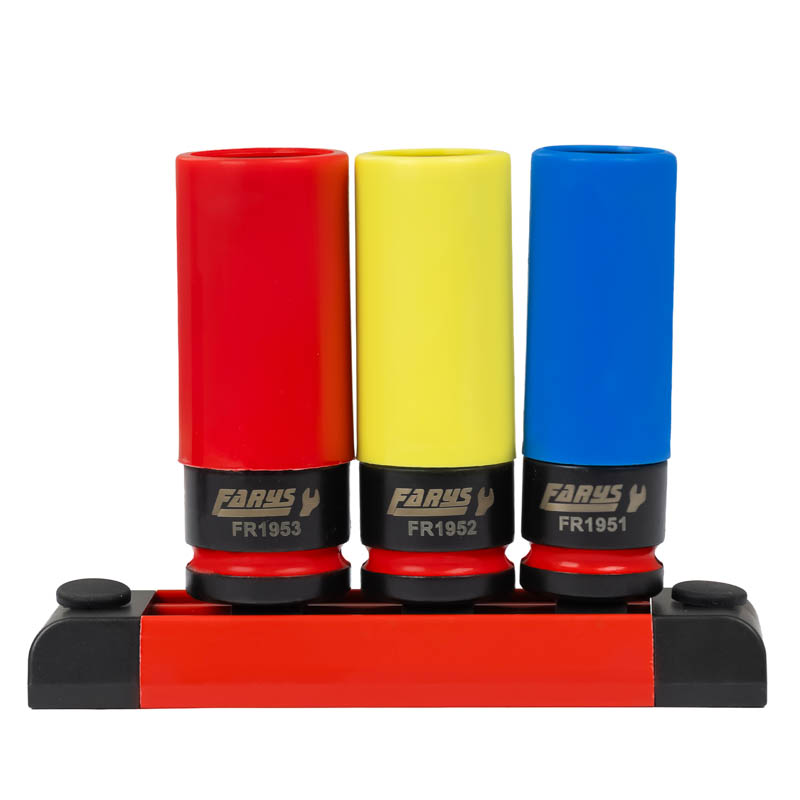 Zestaw nasadek udarowych Farys FR1950 przeznaczonych do bezpiecznego odkręcania i dokręcania śrub kół w felgach aluminiowych. Dzięki specjalnej osłonie ochronnej zapobiegają zarysowaniom felg podczas pracy.