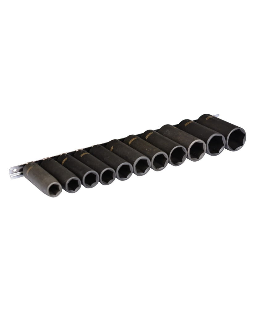 Profesjonalny zestaw nasadek udarowych firmy Farys. Zestaw umieszczony na metalowej listwie co ułatwia przechowywanie wszystkich nasadek. Posiadają otwory które zabezpieczają przez wypadnięciem.