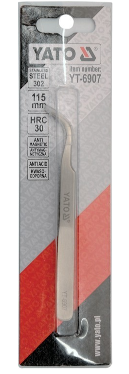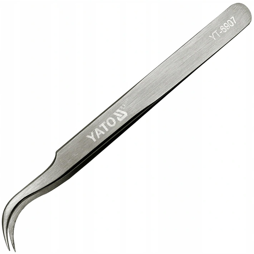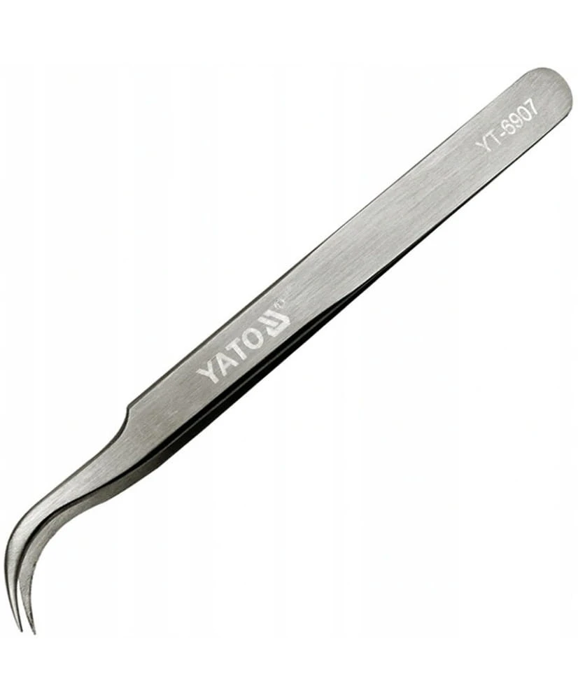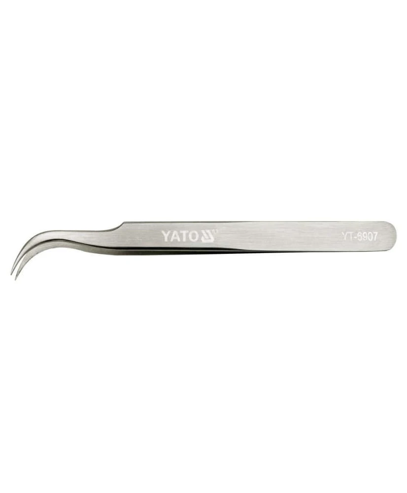Pęseta marki YATO odgięta Model YT-6907 wykonana ze stali nierdzewnej.