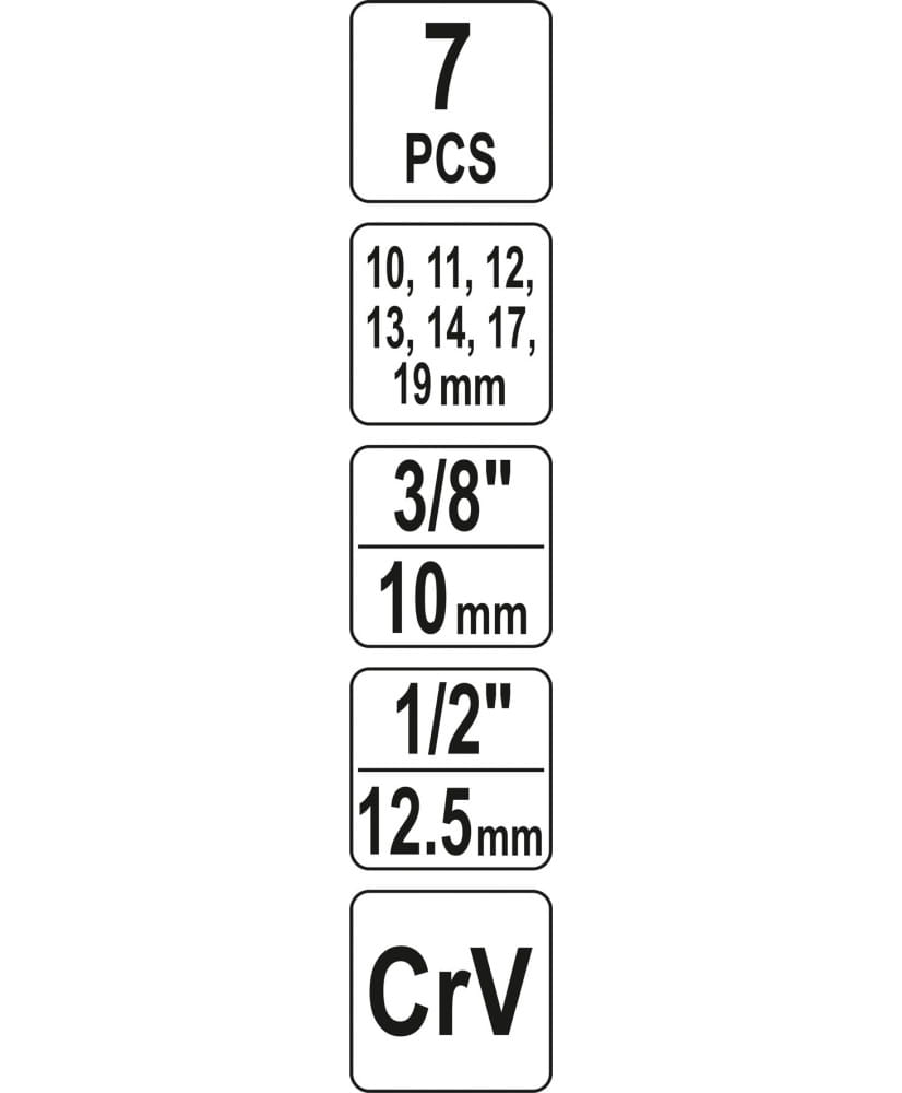 7-elementowy zestaw nasadek otwartych 3/8” oraz 1/2”.