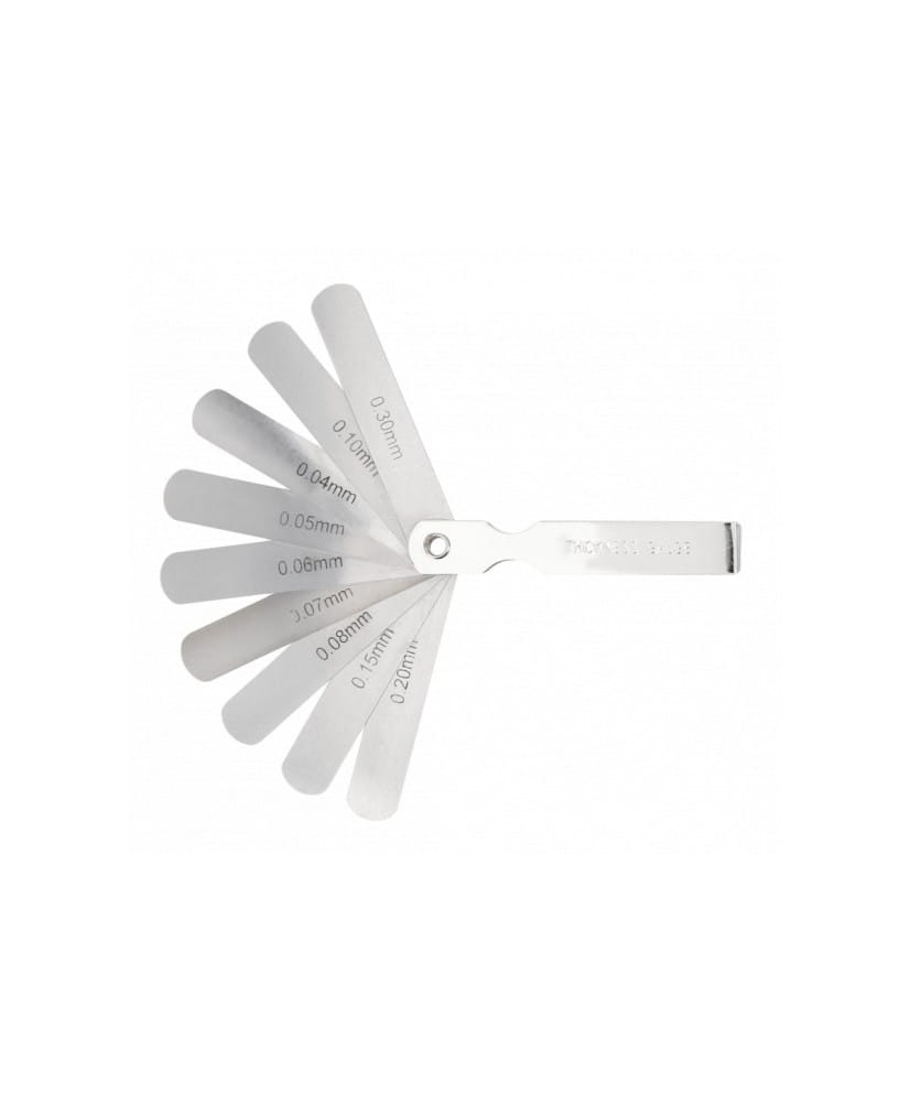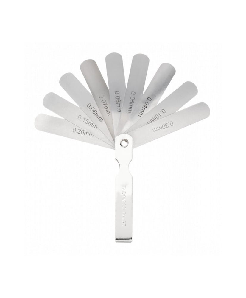 - ilość listków – 9 blaszek, w rozmiarach: 0,04 mm, 0,05 mm, 0,06 mm, 0,07 mm, 0,08 mm, 0,1 mm, 0,15 mm, 0,2 mm, 0,3 mm