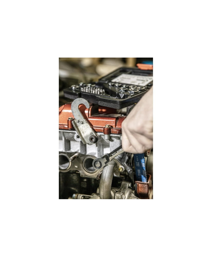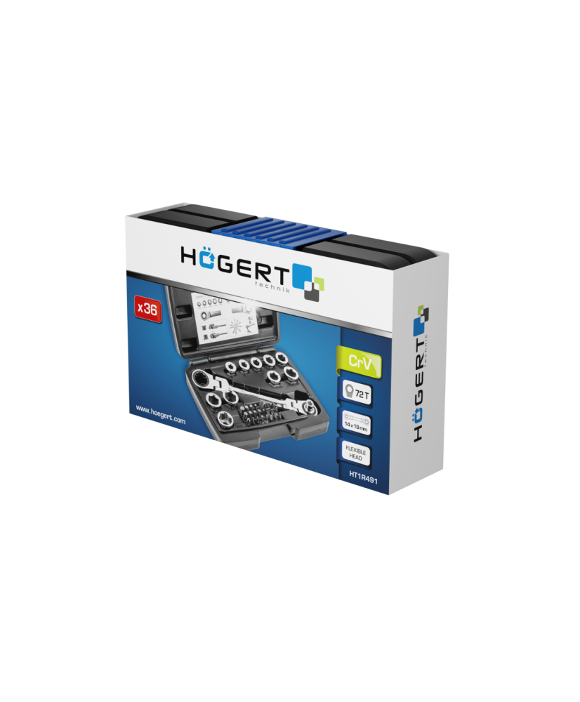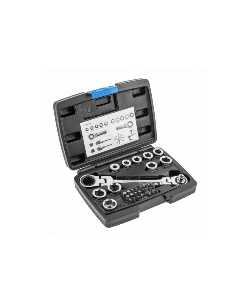 Klucz z grzechotką z przegubem i zestawem specjalnych nasadek, który doskonale sprawdzi się przy odkręcaniu i przykręcaniu połączeń gwintowanych zakończonych elementem mocującym sześciokątnym. Dzięki grzechotce nie zachodzi potrzeba przekładania klucza, natomiast nasadki umożliwiają pracę ze śrubami w różnych rozmiarach. 36-elementowy zestaw umożliwia uzyskanie pełnego zestawu kluczy w rozmiarach 8 – 19 mm.