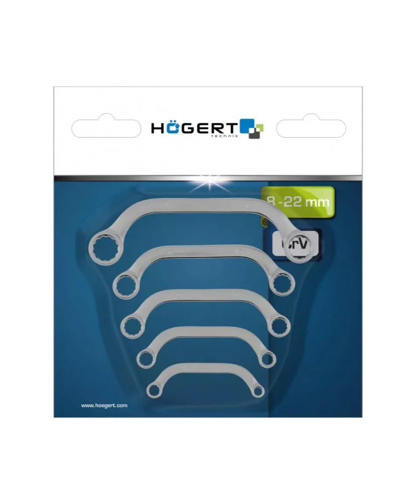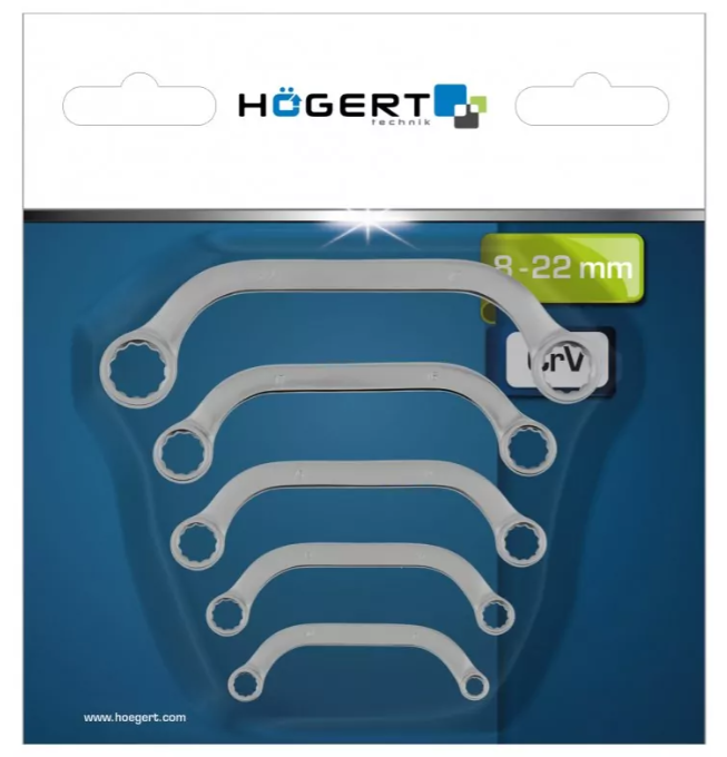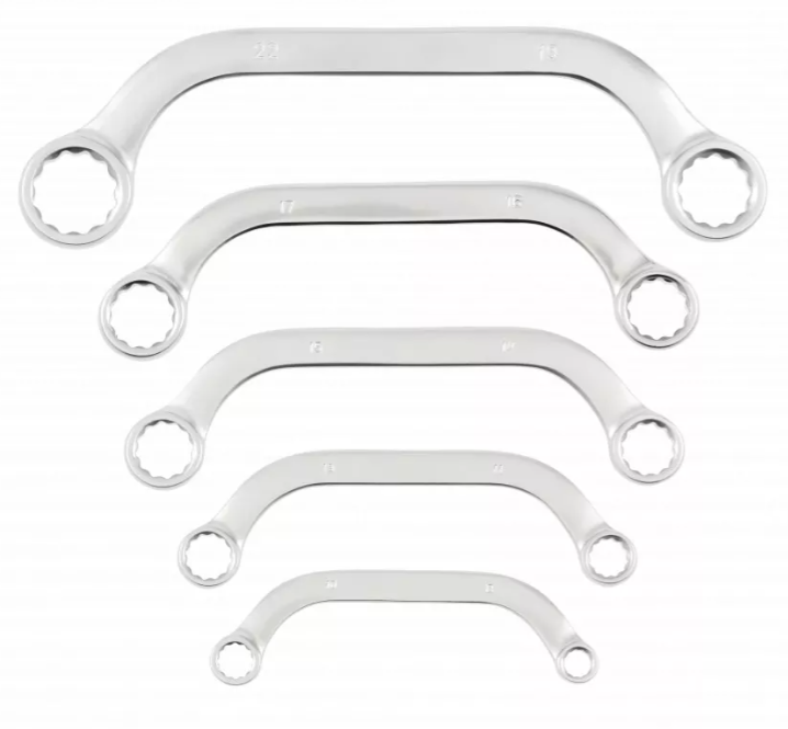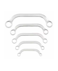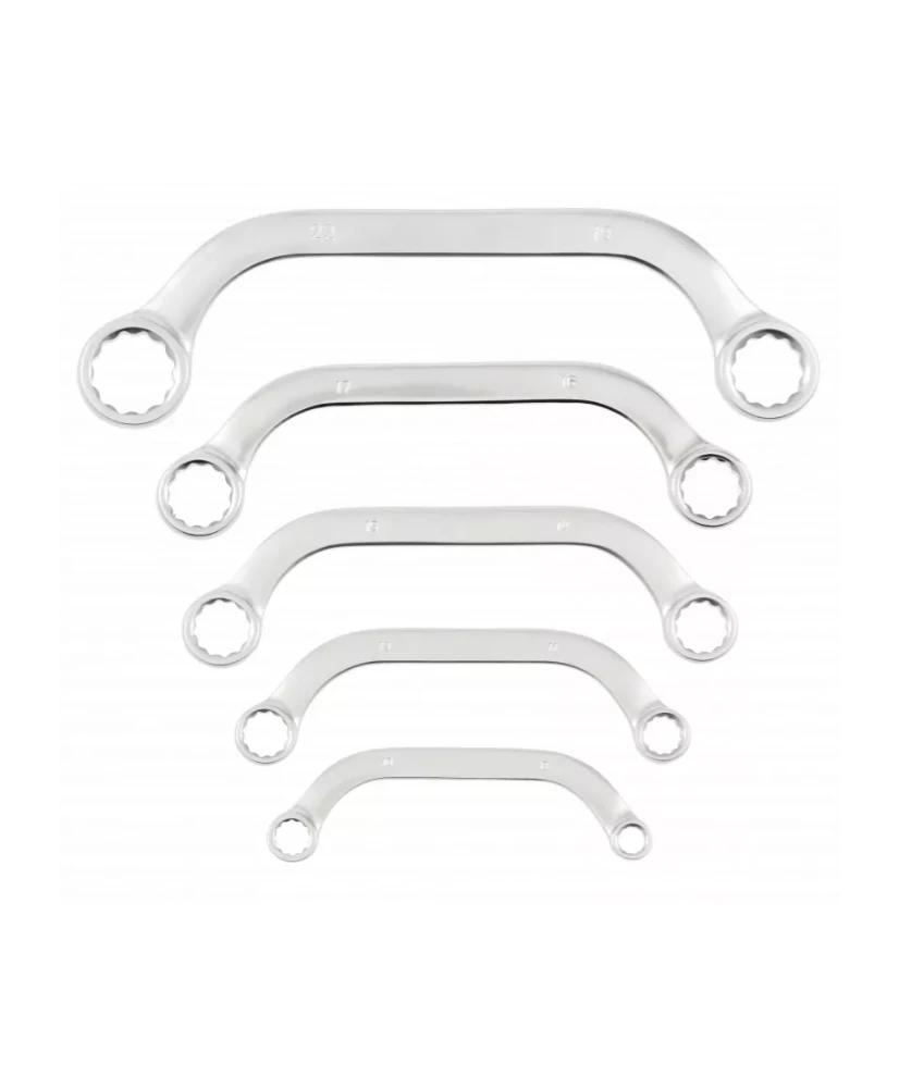 Zestaw pięciu kluczy oczkowych. Klucze dzięki specjalnemu profilowi w kształcie litery C umożliwiają odkręcenie śrub w trudno dostępnych miejscach, np. przy rozrusznikach, kolektorach i alternatorach.
