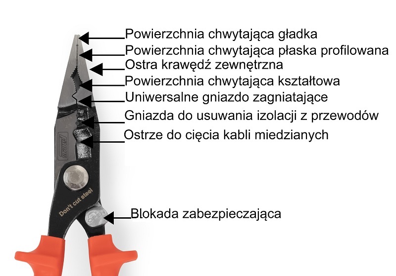 • Uniwersalne szczypce do prac elektroinstalacyjnych, umożliwiające chwytanie materiałów o różnym kształcie i gięcie, gratowanie, cięcie, odizolowywanie przewodów oraz zagniatanie tulejek kablowych.