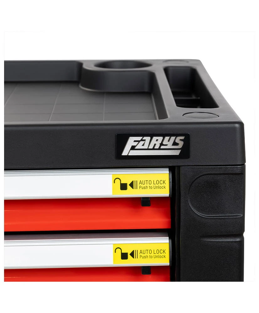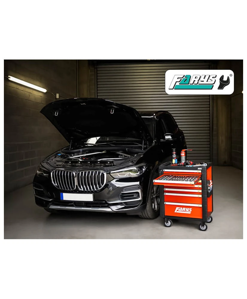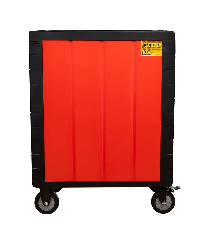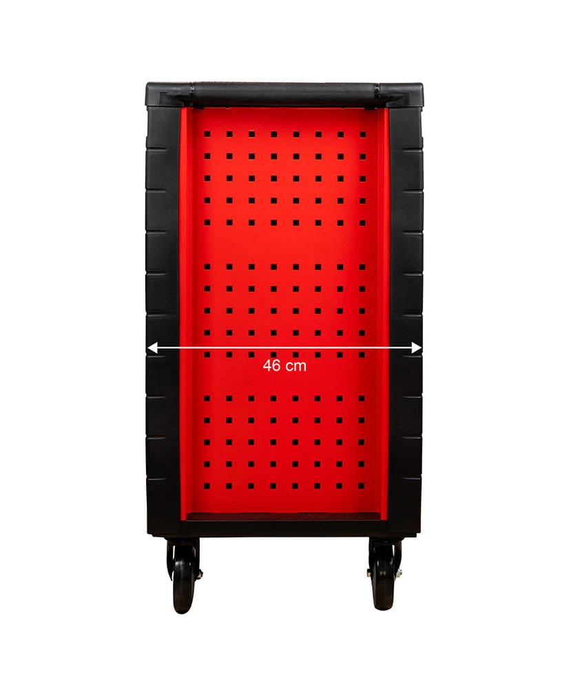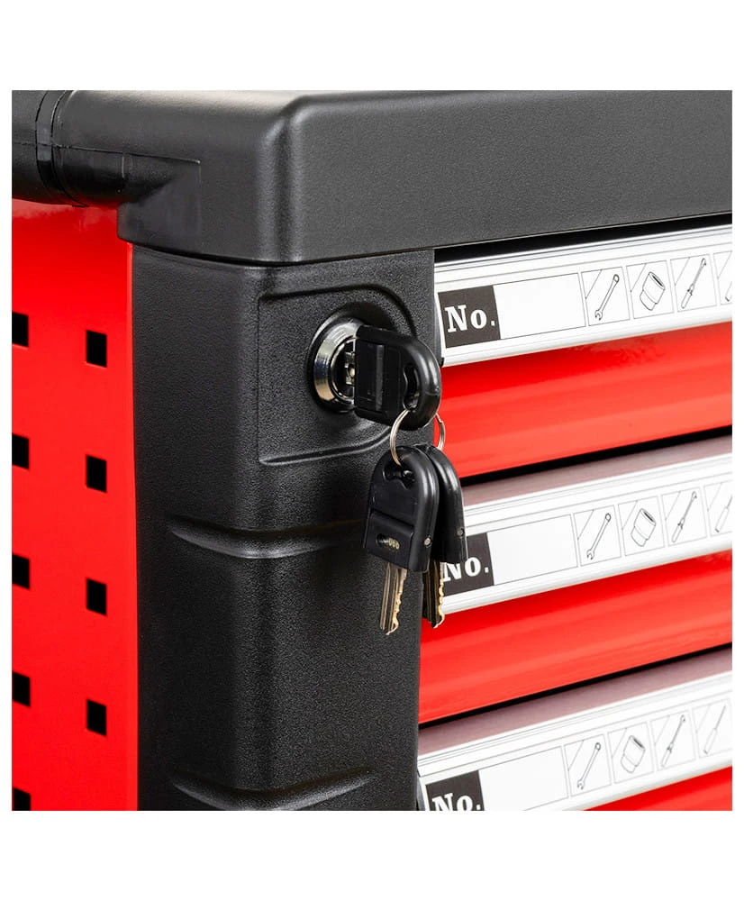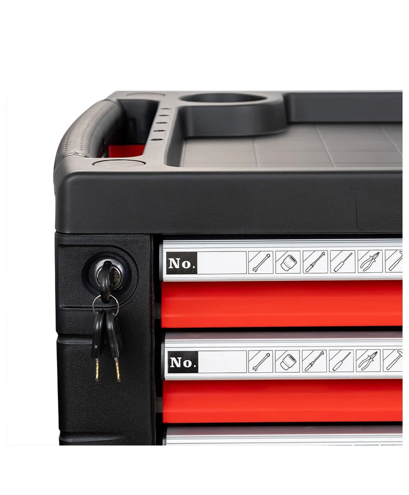 Solidna konstrukcja wózka zapewnia maksymalne bezpieczeństwo, a trwałe kółka umożliwiają łatwe przemieszczanie. Dzięki temu narzędziu każda praca staje się bardziej komfortowa. Ostatnia szuflada jest głębsza, co pozwala na przechowywanie większych narzędzi.