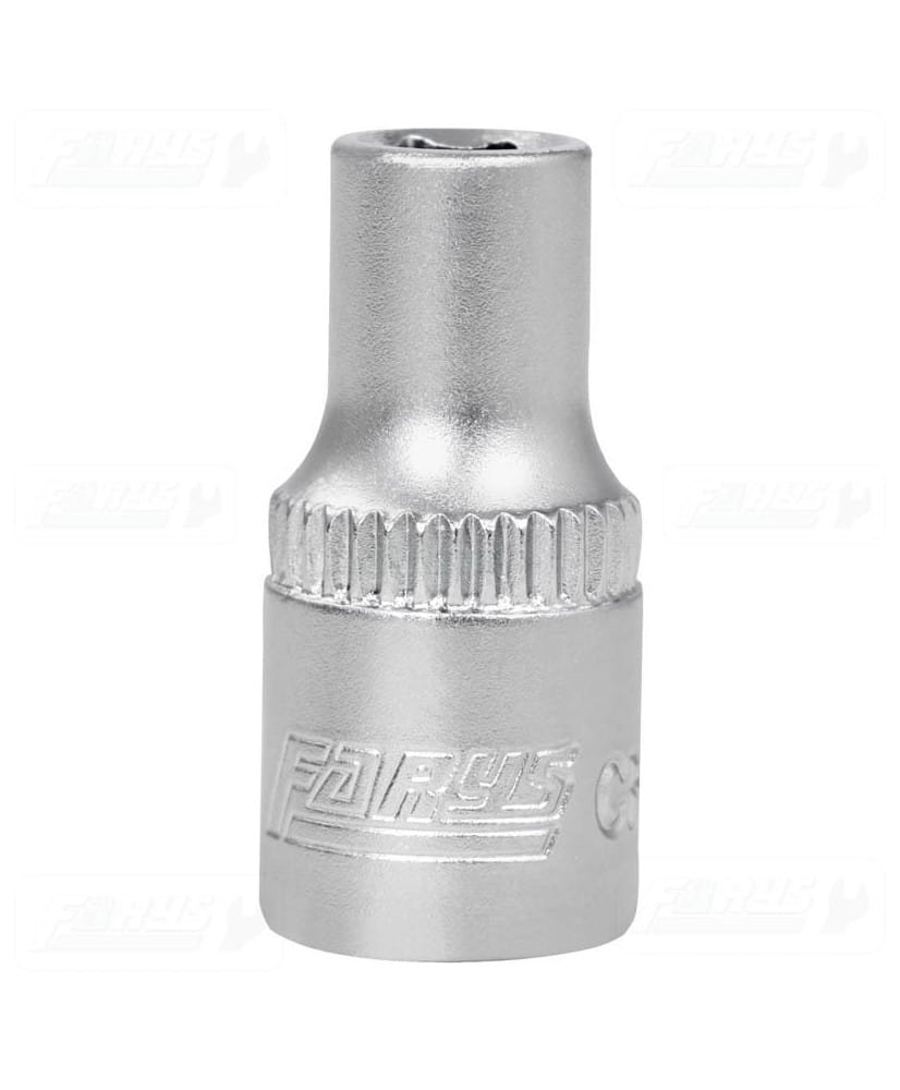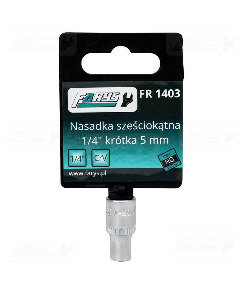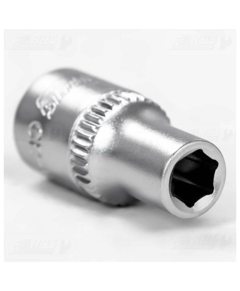 Krótka nasadka metryczna sześciokątna na trzpień kwadratowy 1/4", wykonana z wysokogatunkowej stali chromowo-wanadowej z pojedyńczym radełkowaniem.