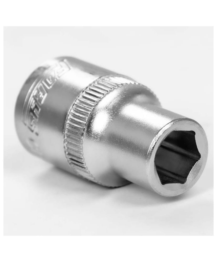 Krótka nasadka metryczna sześciokątna na trzpień kwadratowy 1/2", wykonana z wysokogatunkowej stali chromowo-wanadowej z pojedynczym radełkowaniem.