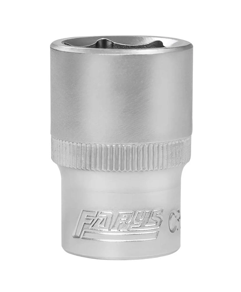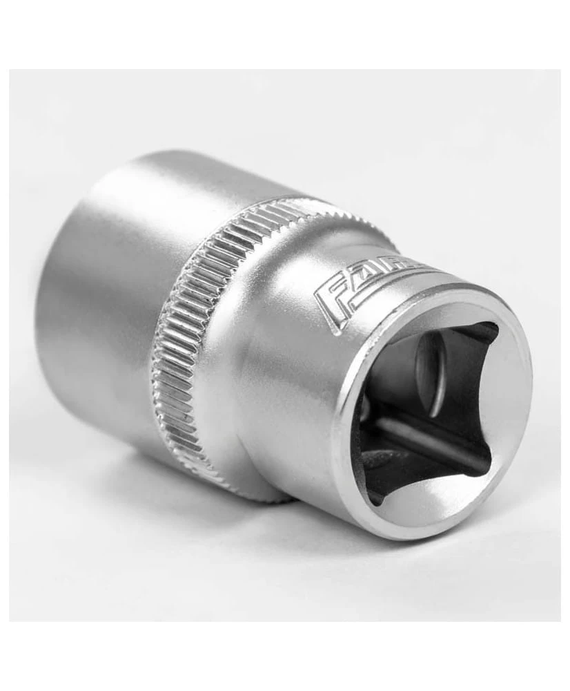 Krótka nasadka metryczna sześciokątna na trzpień kwadratowy 1/2", wykonana z wysokogatunkowej stali chromowo-wanadowej z pojedynczym radełkowaniem.