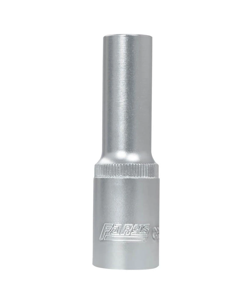 Długa nasadka metryczna sześciokątna na trzpień kwadratowy 1/2", wykonana z wysokogatunkowej stali chromowo-wanadowej z pojedynczym radełkowaniem.