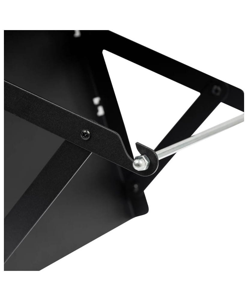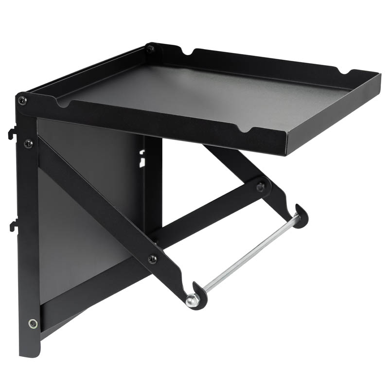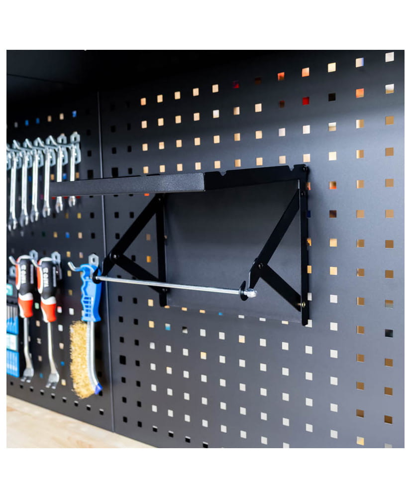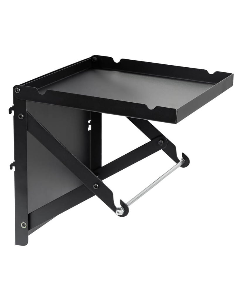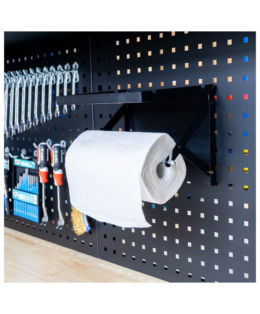 Praktyczny uchwyt na ręcznik papierowy z dodatkową półką to idealne rozwiązanie do warsztatu, garażu lub pracowni. Produkt przeznaczony jest do zawieszenia na boku szafki narzędziowej posiadającej kwadratowe otwory na haczyki, co pozwala na łatwy dostęp do ręcznika oraz zapewnia dodatkowe miejsce na drobne narzędzia lub akcesoria. Wytrzymała metalowa konstrukcja malowana na czarno jest elegancka i fukcjonalna.