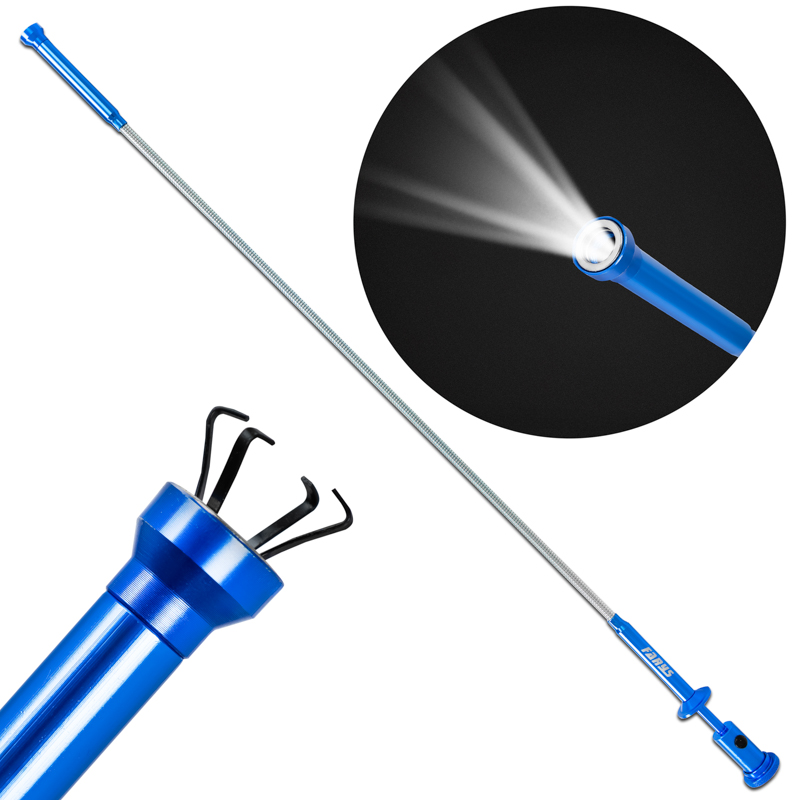 Chwytak magnetyczny z dodatkowym czteroramiennym uchwytem oraz z lampką LED, przeznaczony do podnoszenia cięższych elementów metalowych z trudno dostępnych miejsc.