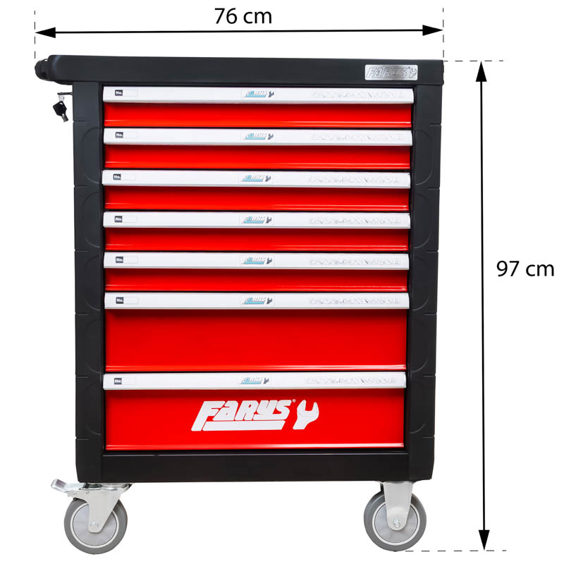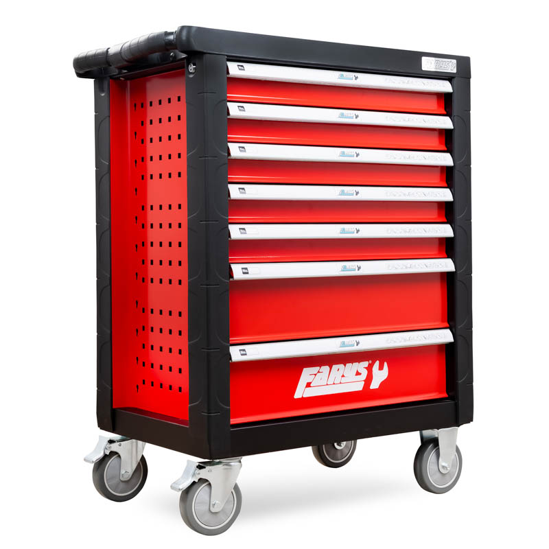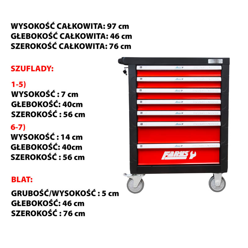Szafka narzędziowa firmy Farys. Blat szafki wykonany z materiału polipropylenowego, wyposażona w ergonomiczny uchwyt zintegrowany z blatem szafki co zapewnia prosty transport szafki. Nasza szafka jest wyposażona w centralny zamek z dwoma kluczami zamykającymi wszystkie szuflady co jest bardzo praktyczne przy pracy na powierzchniach nachylonych pod kątem. Szuflady są osadzone na łożyskach kulkowych oraz wszystkie są w pełni wysuwane. Na kole jest zamontowany hamulec , a boki szafki są wyłożone anty-uderzeniowym materiałem co sprawia że wózek ciężko jest uszkodzić.