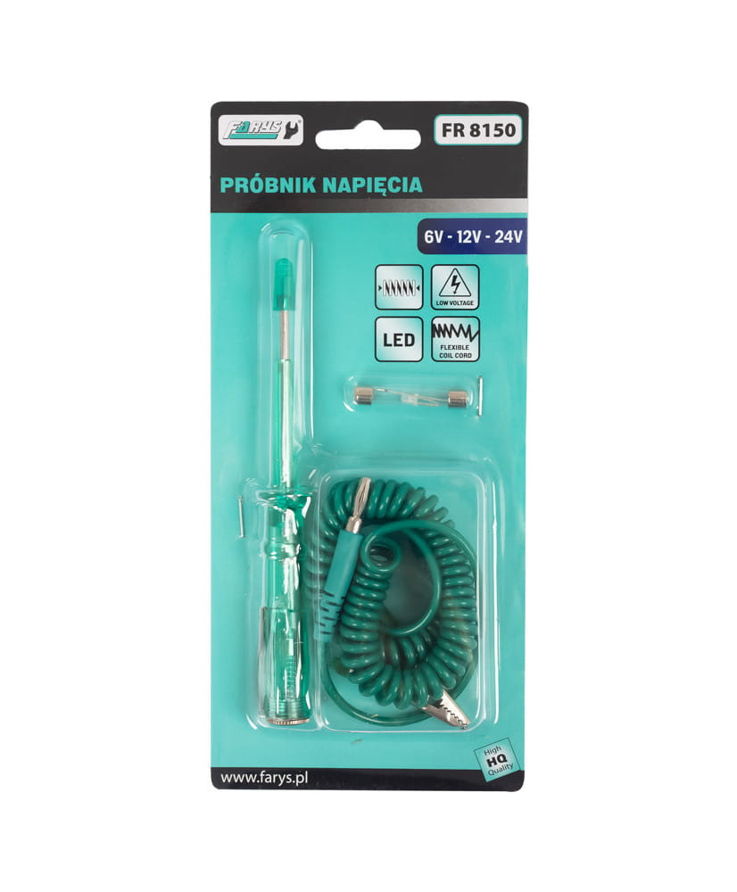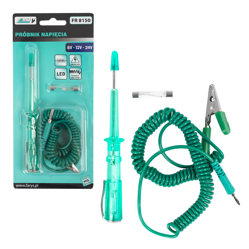 Próbnik elektryczny samochodowy Farys FR8150 o zakresie 6-24 V, ze wskaźnikiem świetlnym. Umożliwia sprawdzanie przepływu prądu w instalacjach elektrycznych motocykli, samochodów osobowych i ciężarowych. Stanowi doskonałe uzupełnienie zestawu narzędzi każdego kierowcy, przydatny w warsztacie.