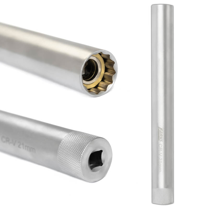 Wysokiej jakości cienkościenny klucz do świec, jego długość umożliwia prace w ciasnych przestrzeniach głowicy silnika.