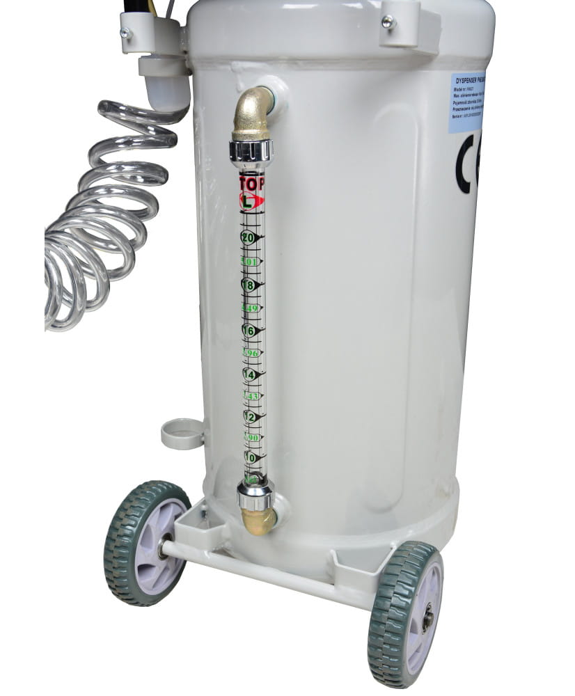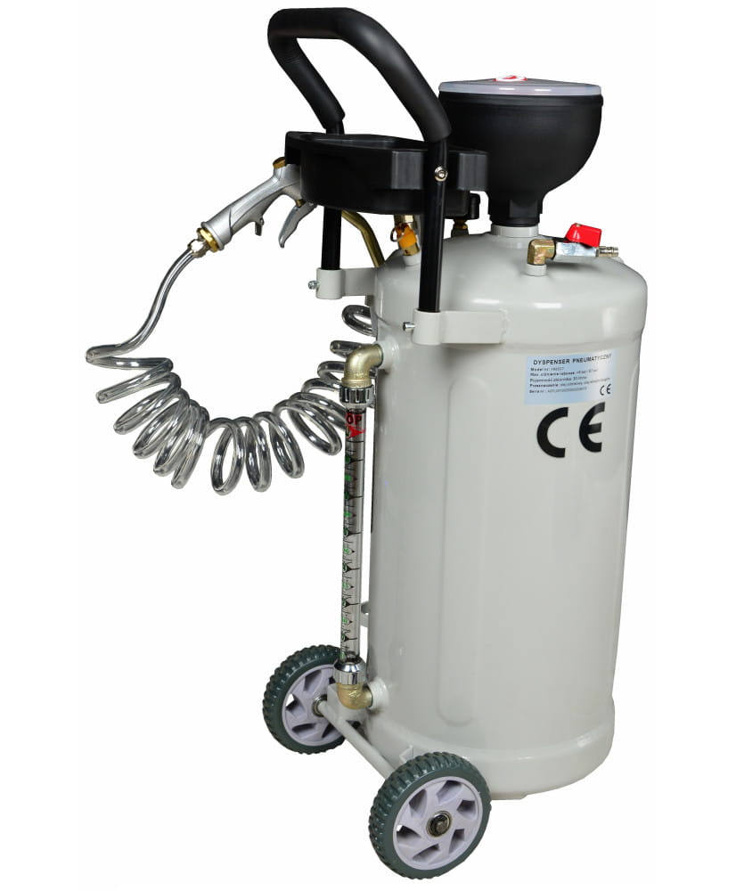 Profesjonalny dyspenser pneumatyczny do oleju. Niezbędna pomoc w każdym warsztacie samochodowym i serwisie. Dzięki zastosowaniu zasilania pneumatycznego praca staje się dużo szybsza i komfortowa.
