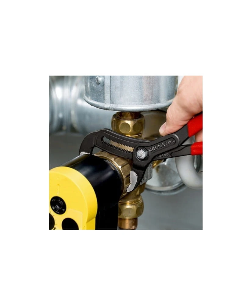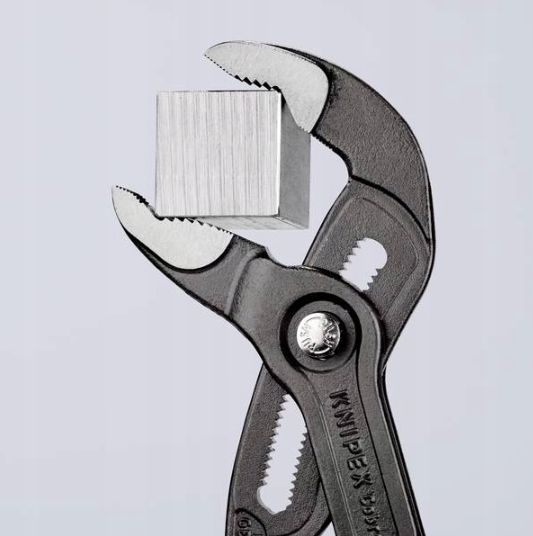 KNIPEX Cobra® - szczypce do rur nowej generacji. Nigdy więcej czasochłonnego dopasowywania rozwarcia szczęk do odpowiedniego rozmiaru. Wystarczy tylko umieścić górną szczękę na chwytanym przedmiocie, nacisnąć przycisk i przyciągnąć dolną szczękę. To takie proste!