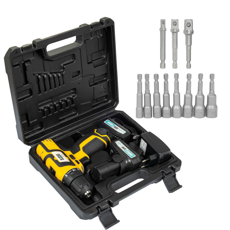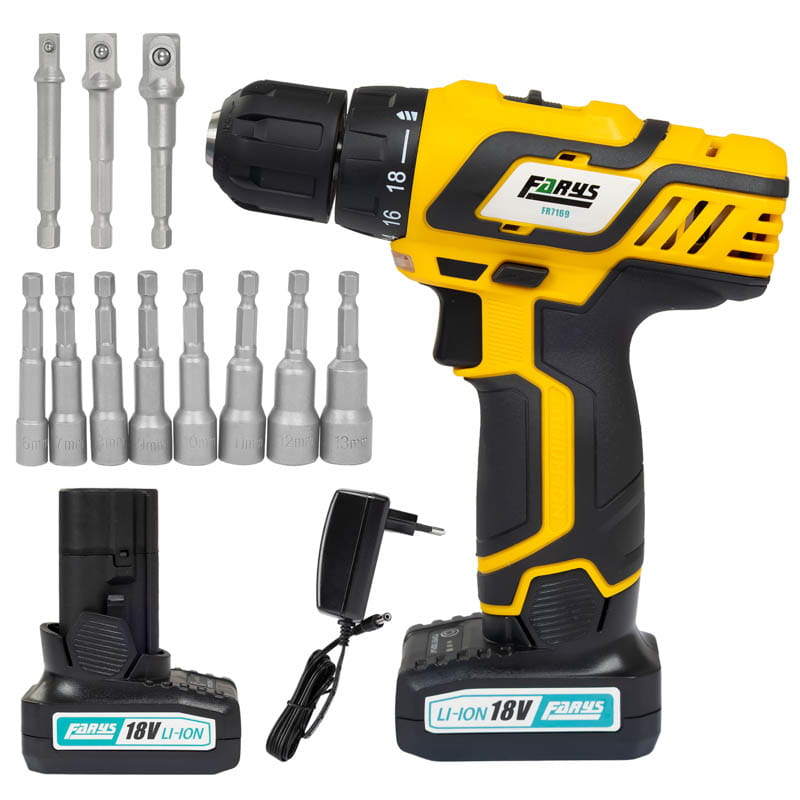 Wiertarko wkrętarka 18V w zestawie z nasadkami i adapterami FR7169+ FR2607+ FR2605